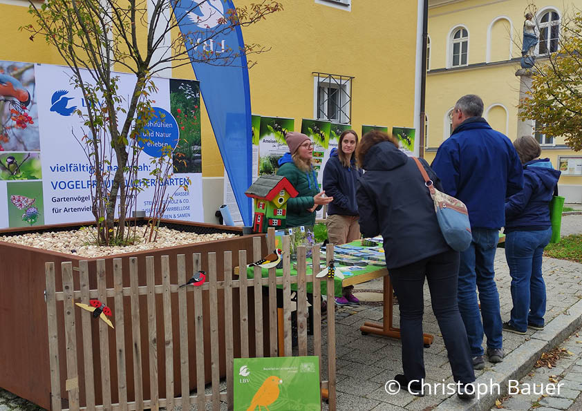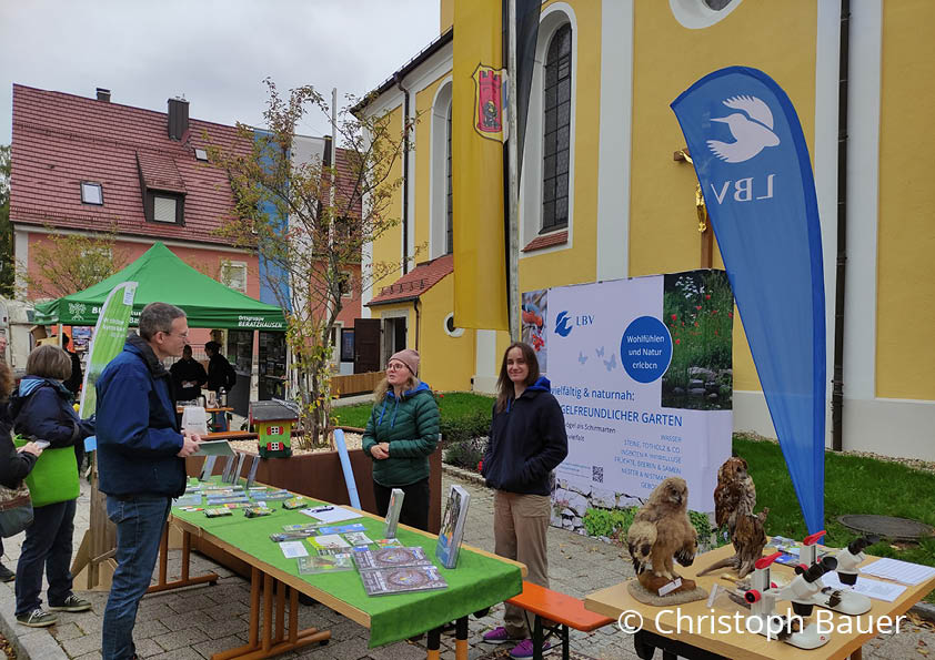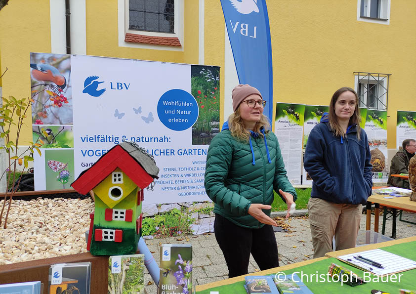 Die LBV-Station Regenstauf ist seit vielen Jahren Kooperationspartner des Schöpfungstags. Diesmal bot das LBV-Team einen Infostand zum Vogelfreundlichen Garten an. Interessierte konnten Federn unter dem Binokular mikroskopieren. Am Nachmittag leitete Christoph Bauer einen Workshop zum „Vogelfreundlichen Garten“ und gab Tipps, wie Gartenbesitzende ihr Wohnumfeld naturnah gestalten können. Der ehem. Naturland-Präsident, Hubert Heigl, stellte ein Kooperationsprojekt von Naturland und LBV zum Schutz von Schwalben an Gebäuden vor.