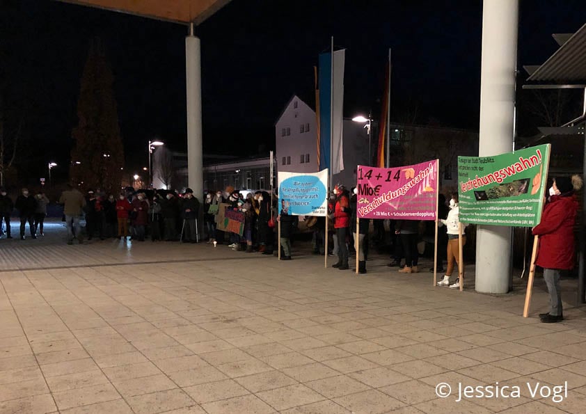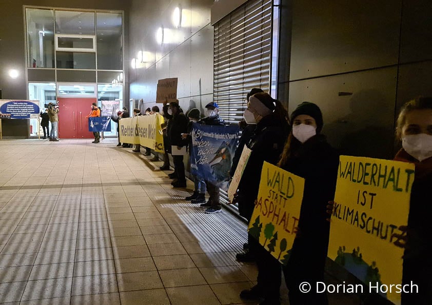 Dafür sollen 20 Hektar Staatswald gerodet werden. Die Sitzung wurde von großem Protest begleitet. Mehr als 150 Menschen haben mit Bannern und Sambatrommeln ihren Widerstand gegen die Planung deutlich gemacht.