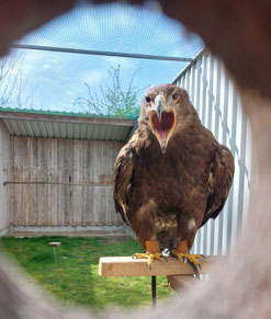 Im Sommer 2024 kamen an einem Tag viele ungewöhnliche Vögel an. Neben 2 Schneeeulen und einem Sibirischen Uhu kam auch ein Steppenadler zu uns. Diese vier Vögel wurden beschlagnahmt, nachdem das Veterinäramt sie entdeckt hat, wie sie auf viel zu engem Raum gehalten wurden. Sie wurden dann von der Polizei zu uns gebracht, bis sie in artgerechte Haltung weitervermittelt werden konnten. Am Anfang konnte der Steppenadler kaum fliegen, weil seine Flugmuskulatur durch die enge Haltung verkümmert war. Seine Kondition hat sich in der große Voliere schnell verbessert und er konnte nach kurzer Zeit wieder bis auf die Sitzstange fliegen, die im Hintergrund zu sehen ist. Inzwischen wurde er in einen Vogelpark zu anderen Steppenadlern in einer großen Voliere weitervermittelt.