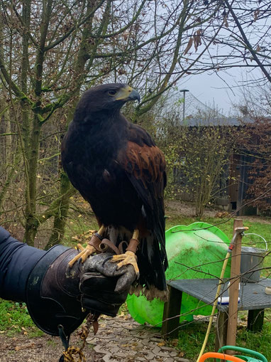 Seit November beherbergte die Station einen adulten Wüstenbussard. Das ist eine Art, die in freier Natur in Deutschland überhaupt nicht heimisch ist, sondern vor allem in Mittel- und Südamerika vorkommt. Aus diesem Grund und weil der Vogel Menschen gegenüber beinahe keine Scheu zeigte, musste davon ausgegangen werden, dass er privat gehalten worden ist. Einen Ring hat er aber nicht getragen. Da eine Auswilderung bei einem solchen Vogel ausgeschlossen ist, wurde er falknerisch trainiert.